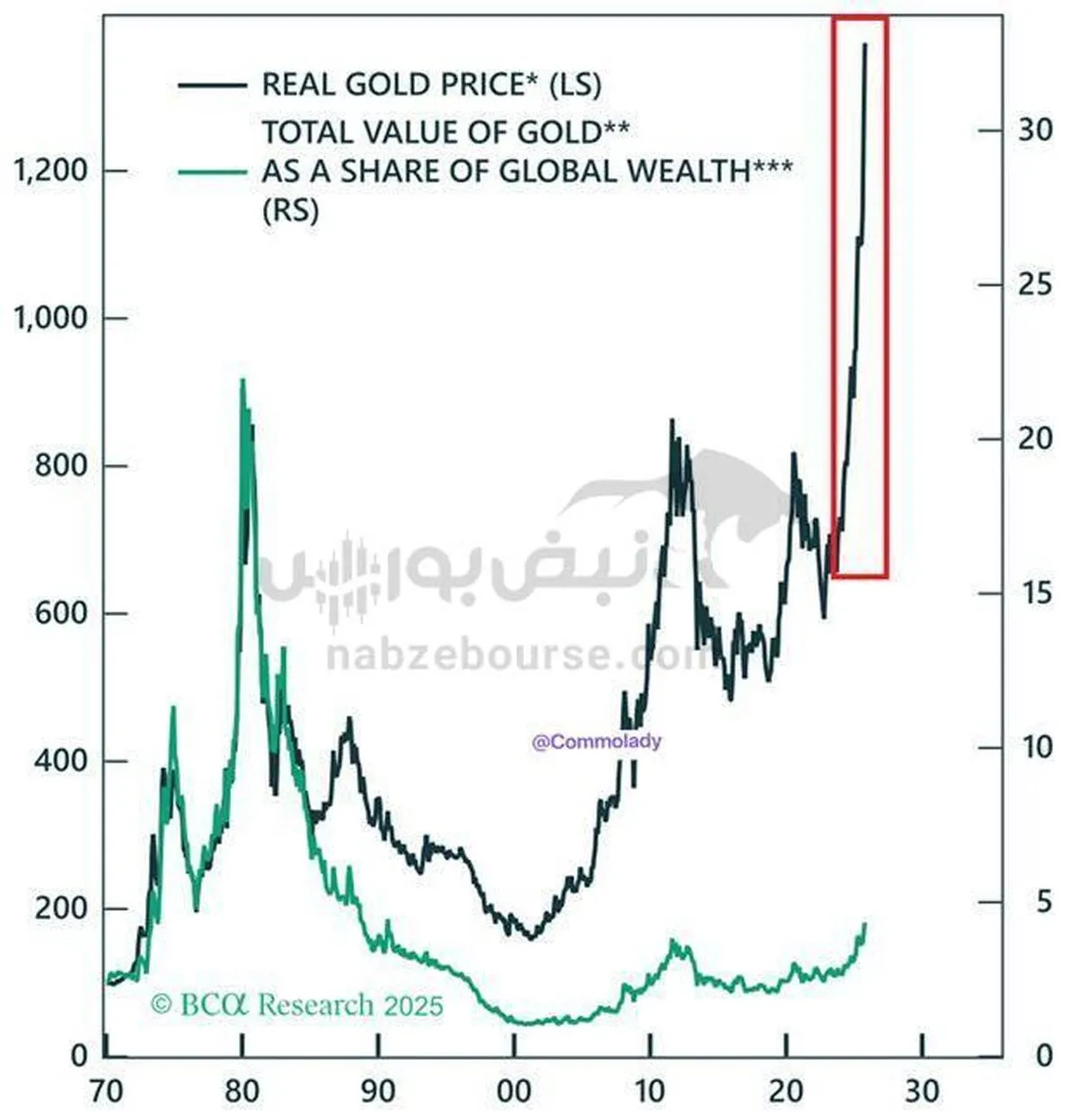 در چهار سال گذشته، قیمت طلا (با در نظر گرفتن تورم) بیش از دو برابر شده است.در همین زمان، ارزش کل بازار طلا به‌عنوان درصدی از ثروت جهانی به حدود ۴ درصد رسیده که بالاترین سطح از دهه ۱۹۹۰ تاکنون است.