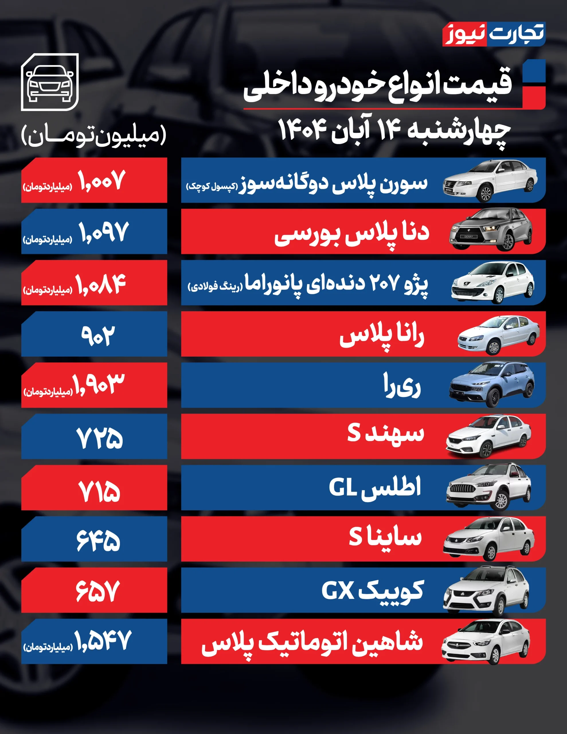 قیمت خودرو امروز ۱۴ آبان ۱۴۰۴