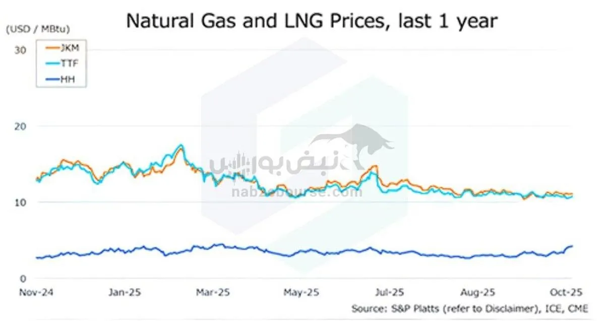 به گزارش نبض بورس، در آسیا (NE Asia)، قیمت نقطهای LNG برای تحویل دسامبر (JKM) بین ۲۷ تا ۳۱ اکتبر تقریباً ثابت در حدود پایین ۱۱ دلار/MBtu باقی ماند. قیمتها پس از سه روز کاهش متوالی تا زیر ۱۱ دلار، بهخاطر کاهش دما و خرید زمستانی چین اندکی بازیابی شد، اما روند نرم باقی ماند. موجودی LNG ژاپن برای تولید برق در ۲۶ اکتبر ۱.۹۷ میلیون تن گزارش شد که ۰.۱۶ میلیون تن کمتر از هفته قبل بود.
