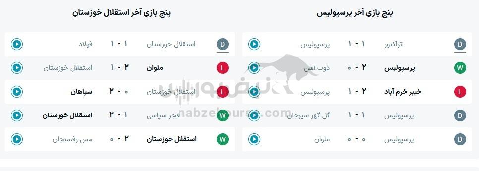 در پنج بازی اخیر پرسپولیس 3 مساوی و 1 باخت و 1 برد حاصل شده است و در پنج بازی اخیر استقلال خوزستان 1 مساوی و 2 باخت و 2 برد حاصل شده است.