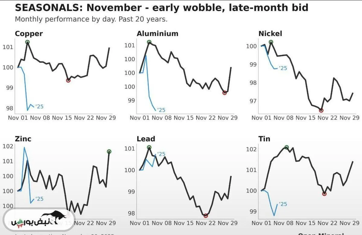 قلع و روی بهترین عملکردها را در نوامبر داشتهاند؛ نیکل و سرب معمولاً عقب میمانند؛ مس و آلومینیوم عموماً خنثی هستند.