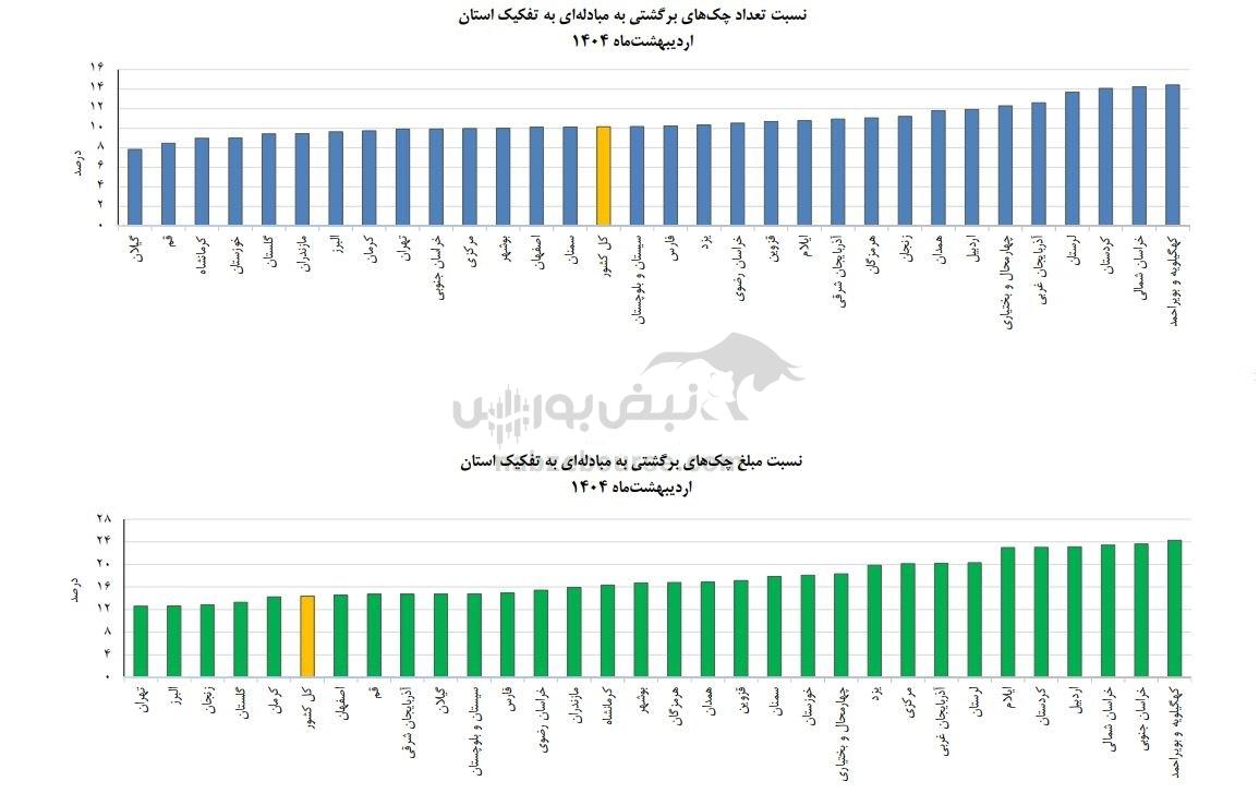 در سوی مقابل، استانهای کردستان و خراسان شمالی کمترین نسبت چکهای وصولی به مبادلهای را ثبت کردهاند. همچنین در شاخص چکهای برگشتی به مبادلهای، بالاترین نرخ مربوط به مازندران، گیلان و قم بوده است که هر سه استان با نسبت بیش از ۱۰ درصد، وضعیت شکنندهتری از نظر اعتماد مالی میان تجار و بنگاهها دارند.