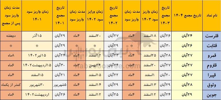 طبق جدول زیر، نمادهایی مانند قلرست، قپیرا، قمرو و وثوق از جمله شرکتهایی هستند که معمولاً سود سهامداران را در کمتر از ۴ ماه پس از مجمع واریز کردهاند.