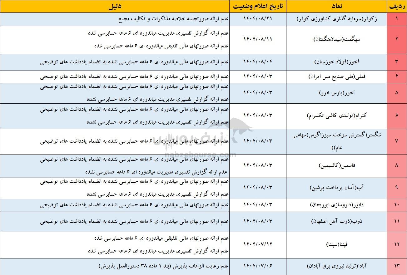 همان گونه که ملاحظه می گردد به گفته شرکت بورس ایران، ۱۳ نماد بنا به دلایل مختلفی مشمول فرآیند تعلیق شده اند و این نمادها در صورت رفع این دلایل از فهرست مشمولین فرآیند تعلیق خارج خواهند شد و در صورت عدم رفع، حکم تعلیق آن ها صادر خواهد شد. بنابراین باید سهامداران مراقب این نمادها باشند.