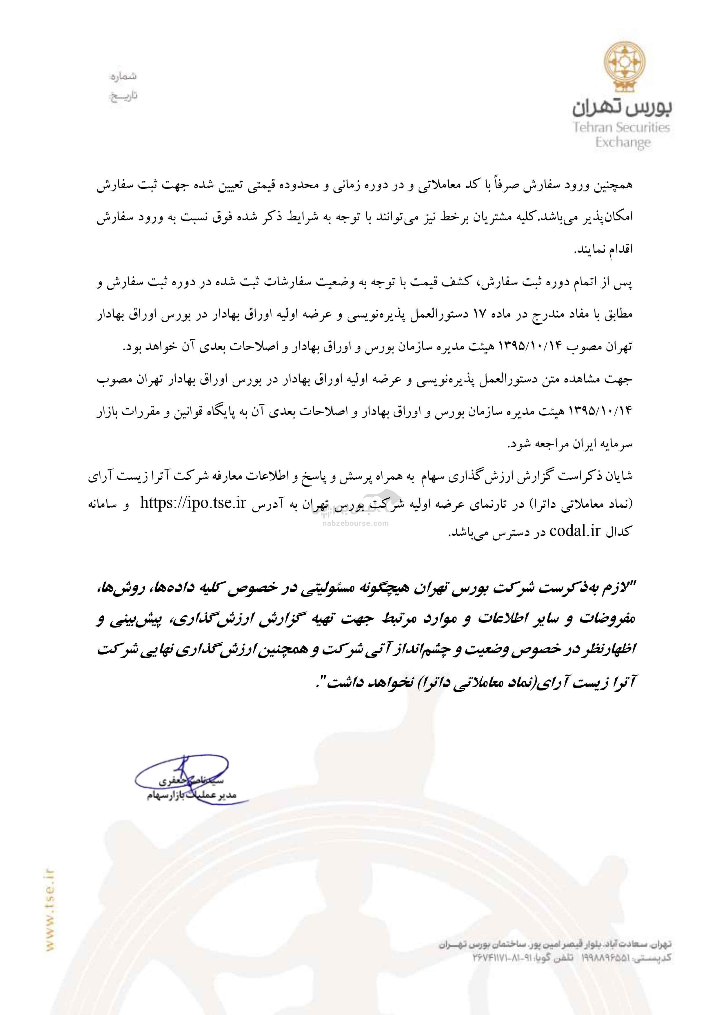 عرضه اولیه سهام شرکت آترا زیست آرای در بورس تهران