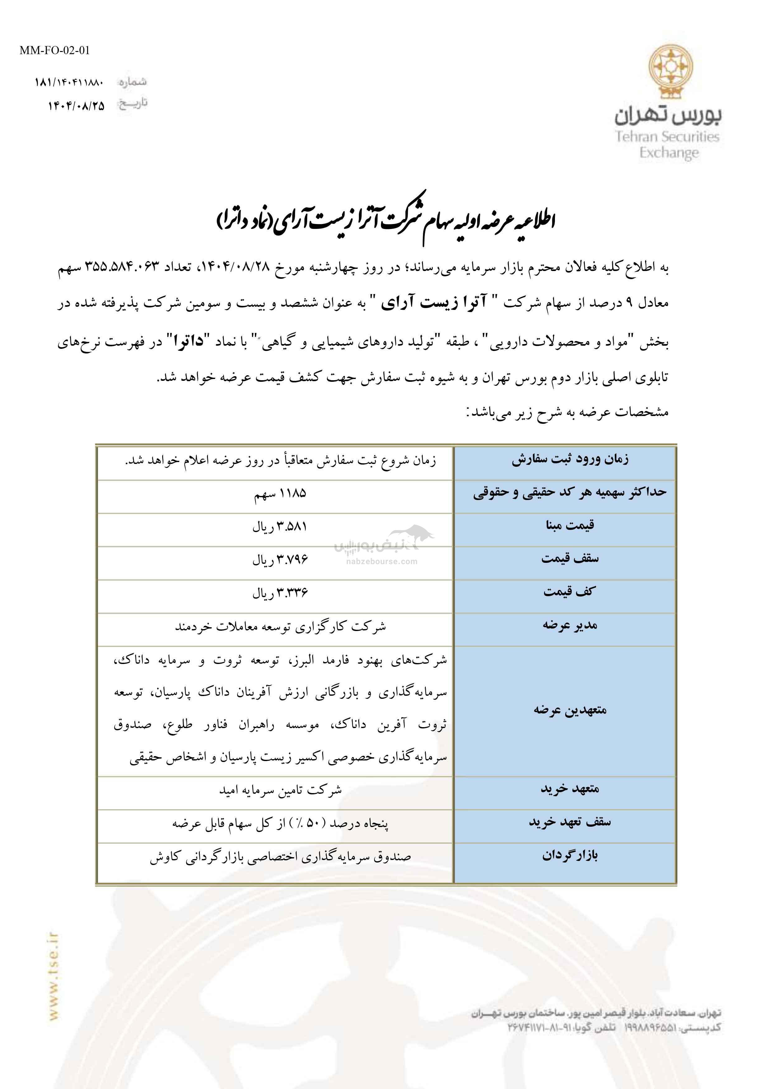 به گزارش مدیریت ارتباطات بورس تهران و به نقل از معاونت عملیات بازار، در روز چهارشنبه مورخ ۱۴۰۴/۰۸/۲۸، تعداد ۳۵۵،۵۸۴،۰۶۳ سهم معادل ۹ درصد از سهام شرکت "آترا زیست آرای" به عنوان ششصد و بیست و سومین شرکت پذیرفته شده در بخش "مواد و محصولات دارویی"، طبقه "تولید داروهای شیمیایی و گیاهی"" با نماد "داترا" در فهرست نرخهای تابلوی اصلی بازار دوم بورس تهران و به شیوه ثبت سفارش جهت کشف قیمت عرضه خواهد شد.