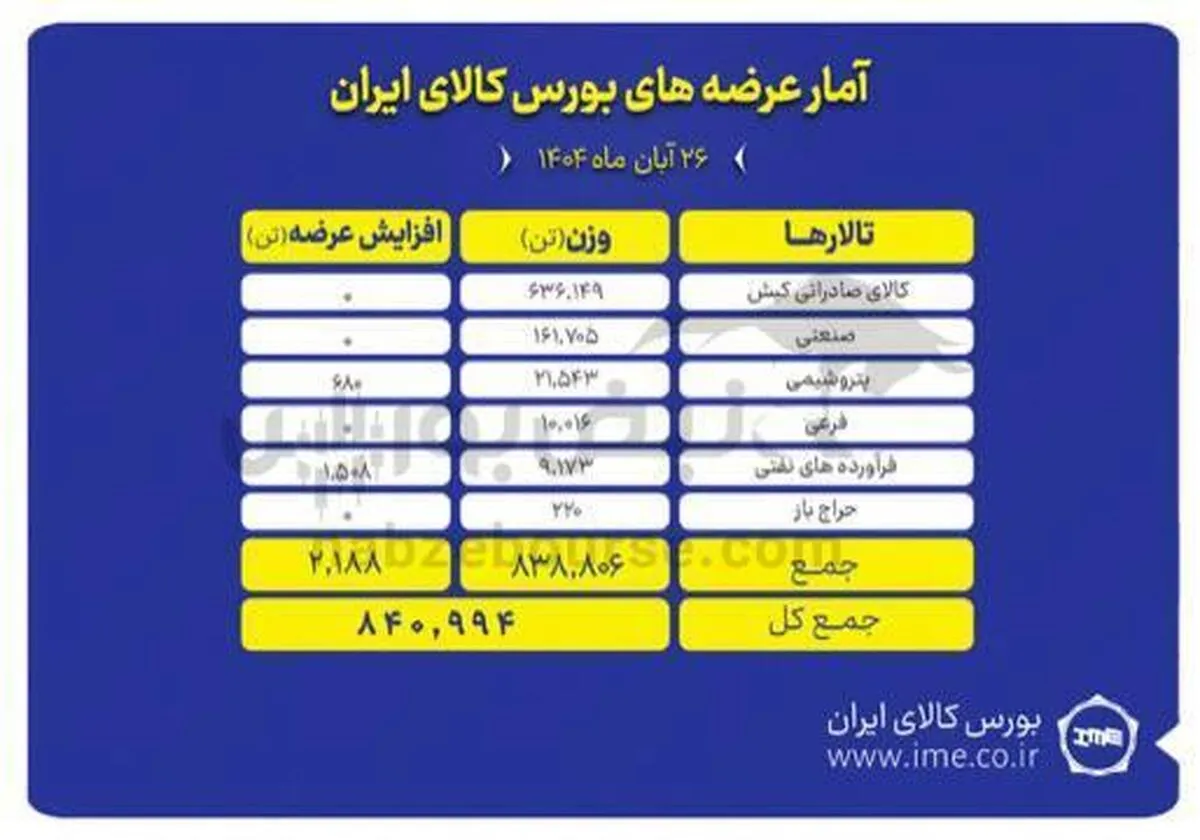 تالارهای بورس کالای ایران امروز دوشنبه ۲۶ آبان ماه میزبان عرضه ۸۴۰ هزار و ۹۹۴ تن انواع محصول است و تالار صادراتی کیش با عرضه بیش از ۶۳۶ هزار تن انواع محصول پیشتاز عرضه های امروز است.