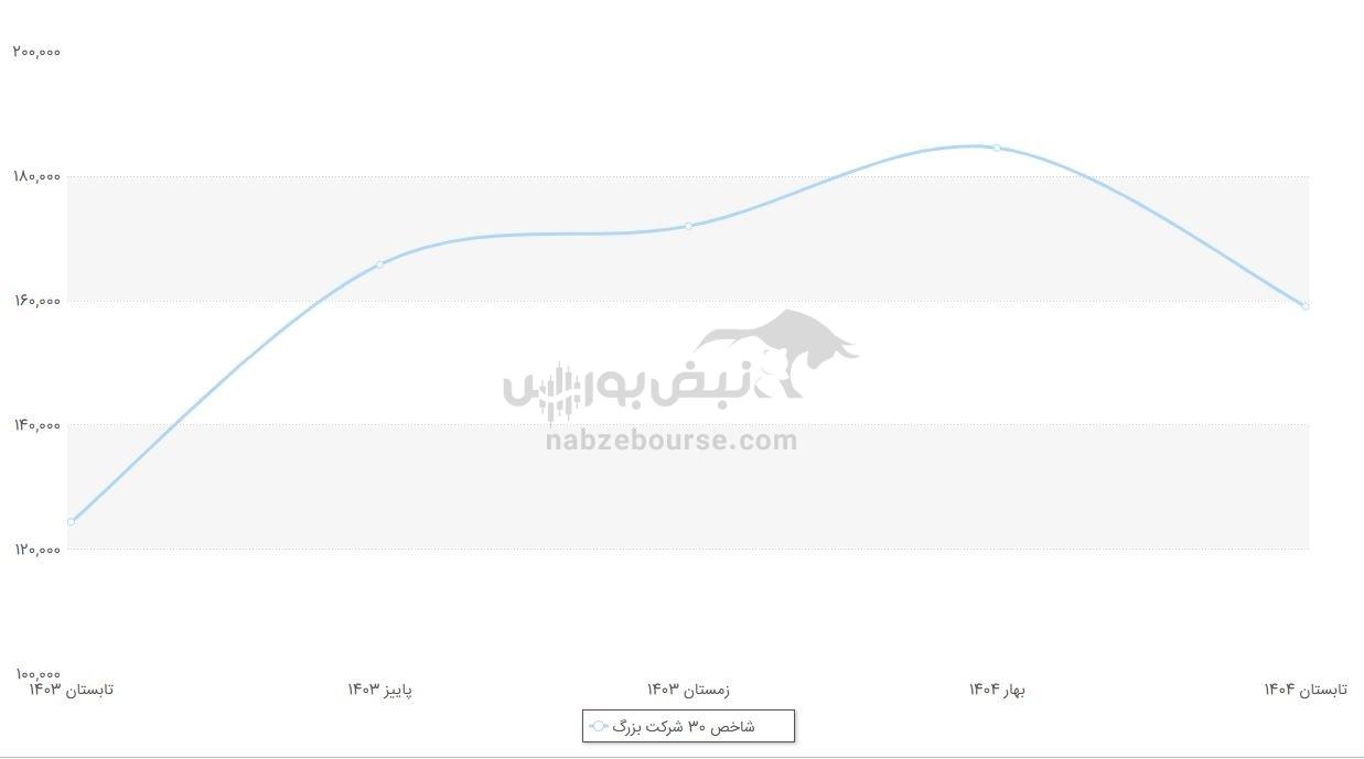 بررسی تغییرات شاخص ۳۰ شرکت بزرگ در یک بازۀ یکساله، تصویری روشن از رفتار بازار ارائه میدهد. این شاخص در تابستان ۱۴۰۳ با ثبت عدد ۱۲۴٬۴۲۸ واحد به کمترین سطح خود در کل دوره رسیده است؛ نقطهای که میتوان از آن بهعنوان کف قیمتی این بازه یاد کرد. عبور از این سطح در فصل بعد، آغازگر یکی از مهمترین جهشهای شاخص بوده است.