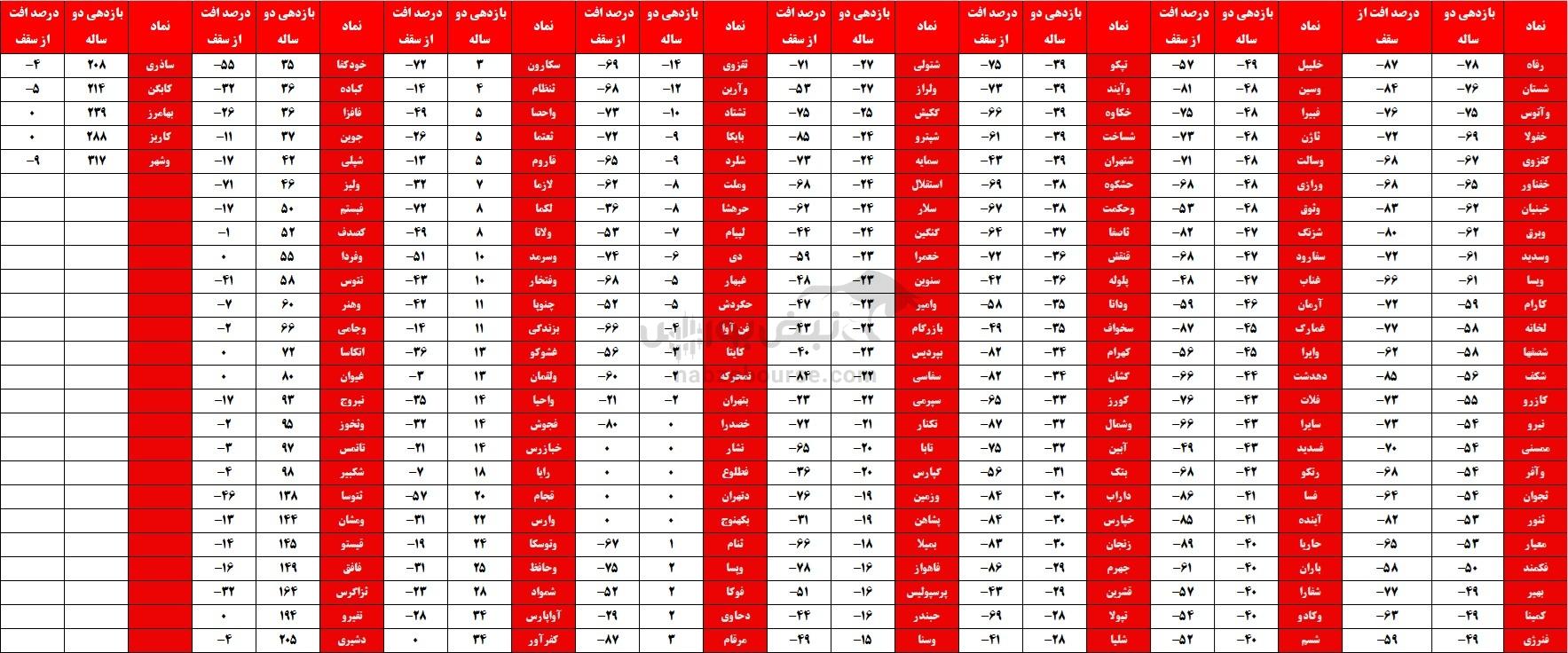 ۱۱ آبان ماه سال ۱۴۰۱ بود که محمدعلی شیرازی به صندلی ریاست فرابورس تکیه زد؛ بنابراین دوران ریاست او بر این نهاد حدود سه سالی بوده است. ما در ادامه بازدهی نماد‌های بازار پایه را از دو سال پیش تاکنون بررسی کردیم. همچنین میزان ریزش این نماد‌ها از سقف را نیز در جدول زیر آورده‌ایم.