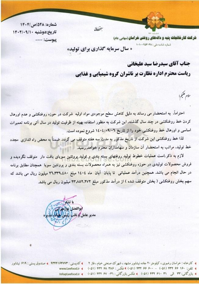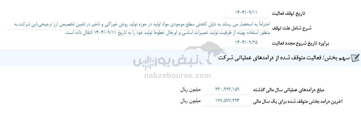 احترامأ به اسحضار میرساند به دلیل کاهش سطح موجودی مواد اولیه در حوزه روغنکشی و عدم اورهال و تعمیرات اساسی طی چند سال آخیر در بخضش روغنکشی، این شرکت به منظور استفاده بهینه از ظرفیت تولید خود در سال مالی آتی، تعمیرات اساسی و اورهال خط تولید روغنکشی خود را از تاریخ ۱۴۰۴/۰۹/۰۶ شروع نموده است.