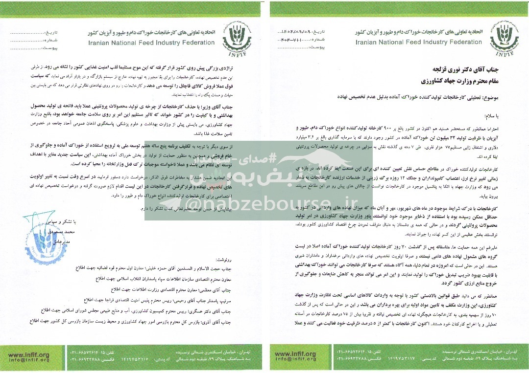 در همین حال و پیش از این، اتحادیه کارخانجات خوراک دام، طیور و آبزیان در نامهای سرگشاده به وزیر جهاد کشاورزی هشدار داده است:
