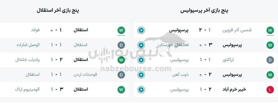 در پنج بازی اخیر 3 برد و 2 تساوی برای استقلال حاصل شده است و در پنج بازی اخیر پرسپولیس  3 برد و 1 تساوی و 1 باخت حاصل شده است.
