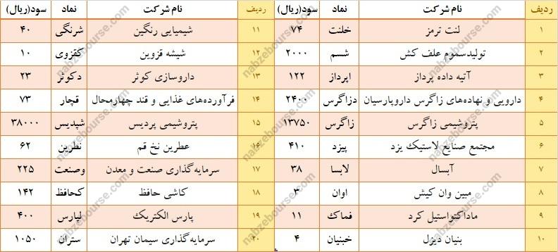 دکوثر: ۲۳ ریال قچار: ۷۳ ریال شپدیس: ۳۸۰۰۰ ریال نطرین: ۶۲ ریال وصنعت: ۲۲۵ ریال کحافظ: ۱۴۲ ریال
