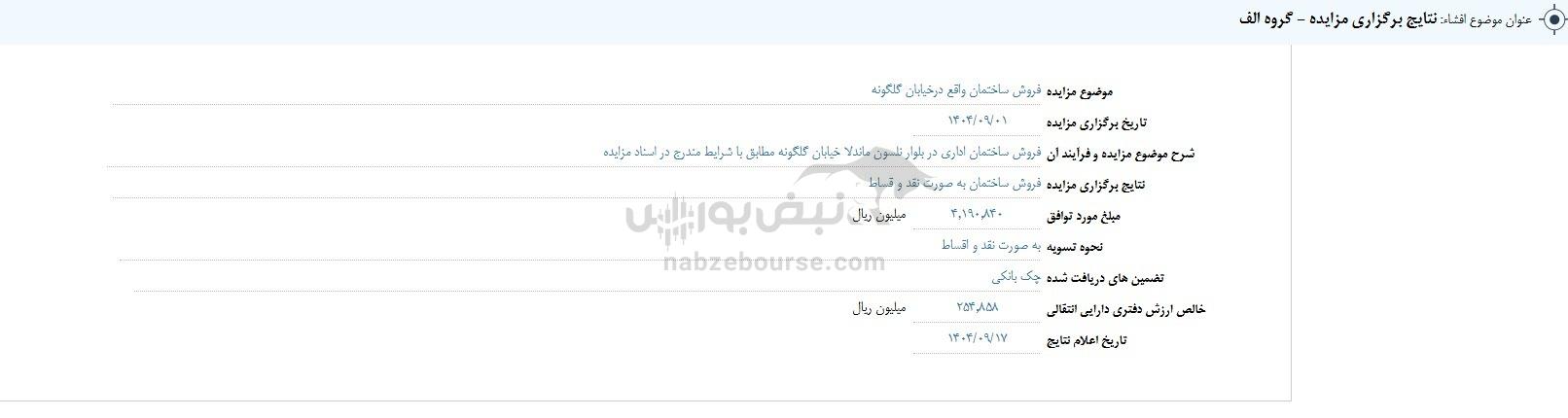 بر اساس این اطلاعیه، مزایده مذکور در تاریخ اول آذر ۱۴۰۴ برگزار شد و پس از بررسی پیشنهادهای دریافتی، فروش ملک به‌صورت نقد و اقساط مورد تأیید قرار گرفت. مبلغ نهایی توافق‌شده برای این معامله ۴ هزار و ۱۹۰ میلیارد و ۸۴۰ میلیون ریال اعلام شده است.