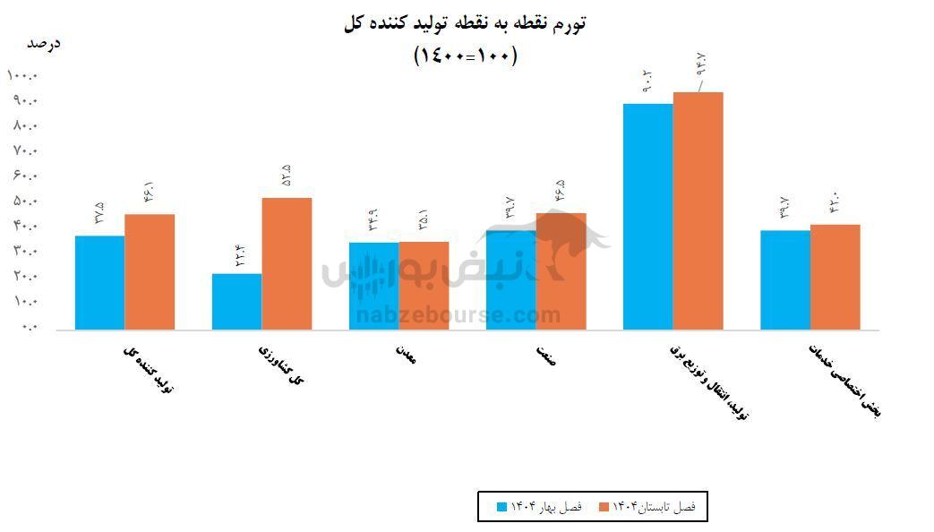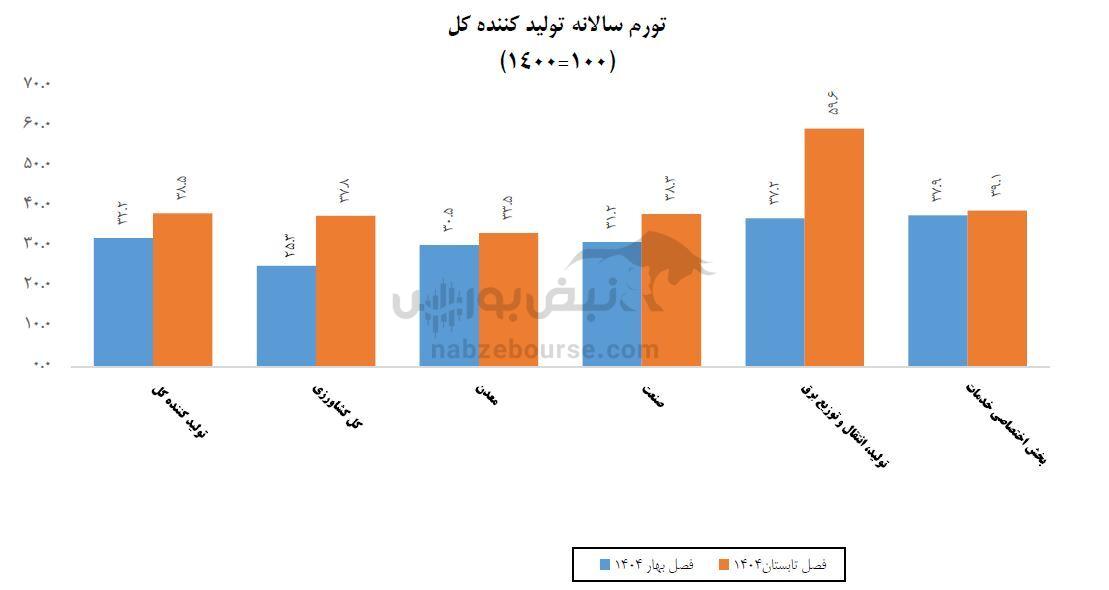 بیشترین تورم نقطهبهنقطه کل اقتصاد در این فصل متعلق به گروه تولید، انتقال و توزیع برق با جهش ۹۰.۲ درصدی است.