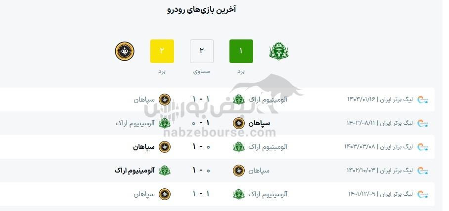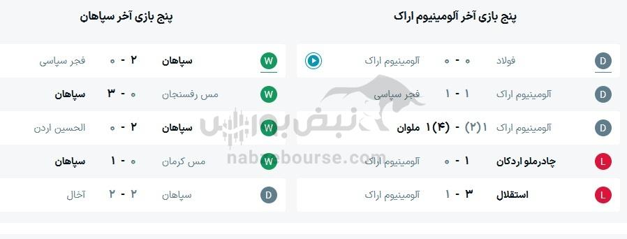 در پنج بازی اخیر 4 برد و 1 تساوی برای سپاهان حاصل شده است و همچنین در پنج بازی اخیر آلومینیوم  3 تساوی و 2 باخت حاصل شده است.
