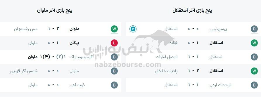 در پنج بازی اخیر 2 برد و 3 تساوی برای استقلال حاصل شده است و همچنین در پنج بازی اخیر ملوان 3 تساوی و 1 برد و 1 باخت حاصل شده است.