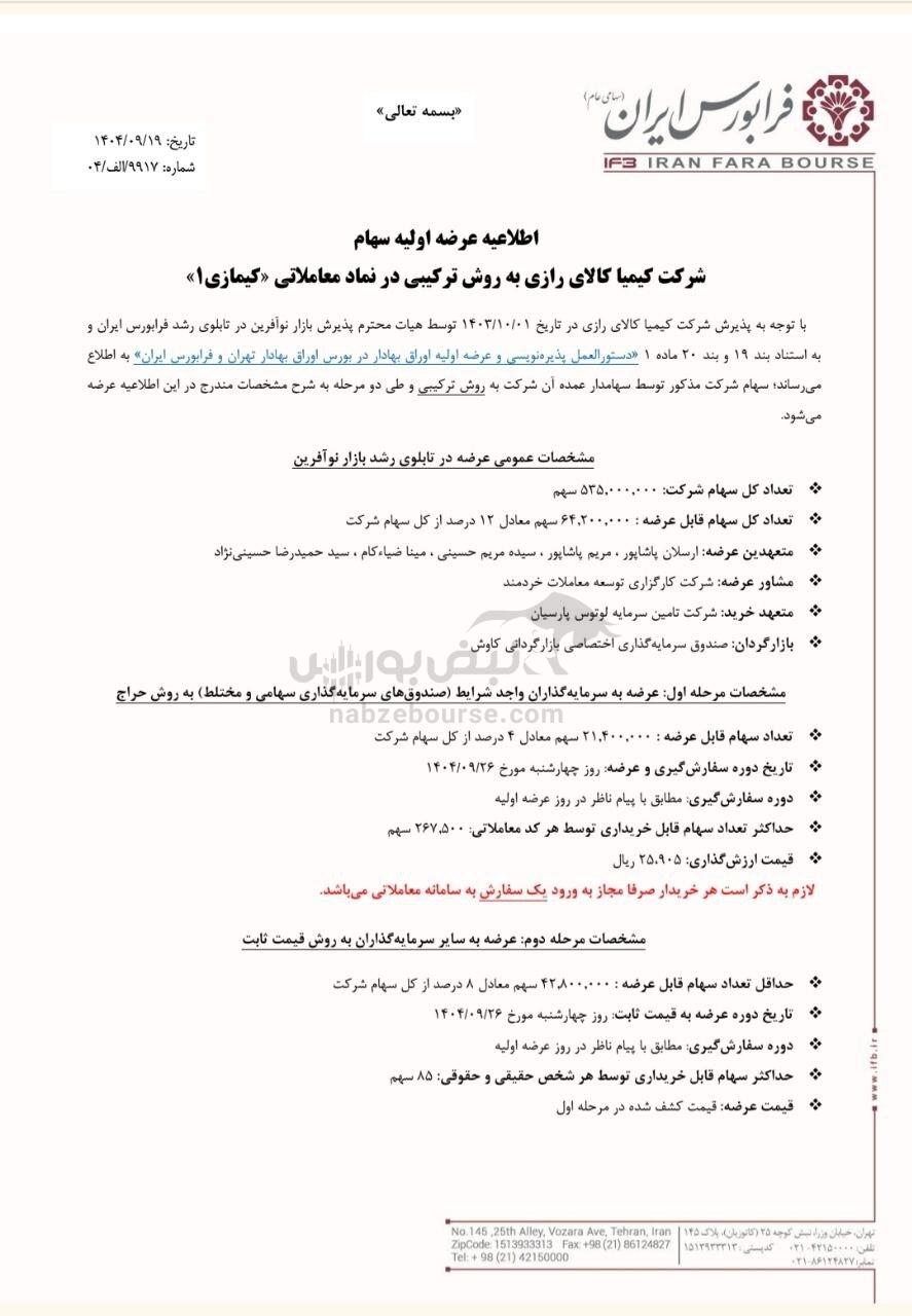 براساس اطلاعیه فرابورس شرکت کیمیا کالای رازی با نماد معاملاتی کیمازی روز چهارشنبه ۲۶ آذر ۱۴۰۴ در بازار دوم فرابورس ایران عرضه اولیه میشود. میزان نقدینگی مورد نیاز برای خرید این عرضه اولیه چقدر است؟