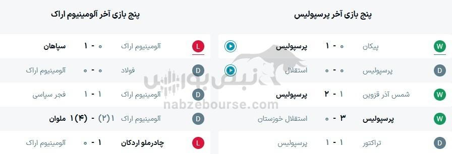 در پنج بازی اخیر 3 برد و 2 تساوی برای پرسپولیس حاصل شده است و همچنین در پنج بازی اخیر آلومینیوم اراک 3 تساوی و 2 باخت حاصل شده است.