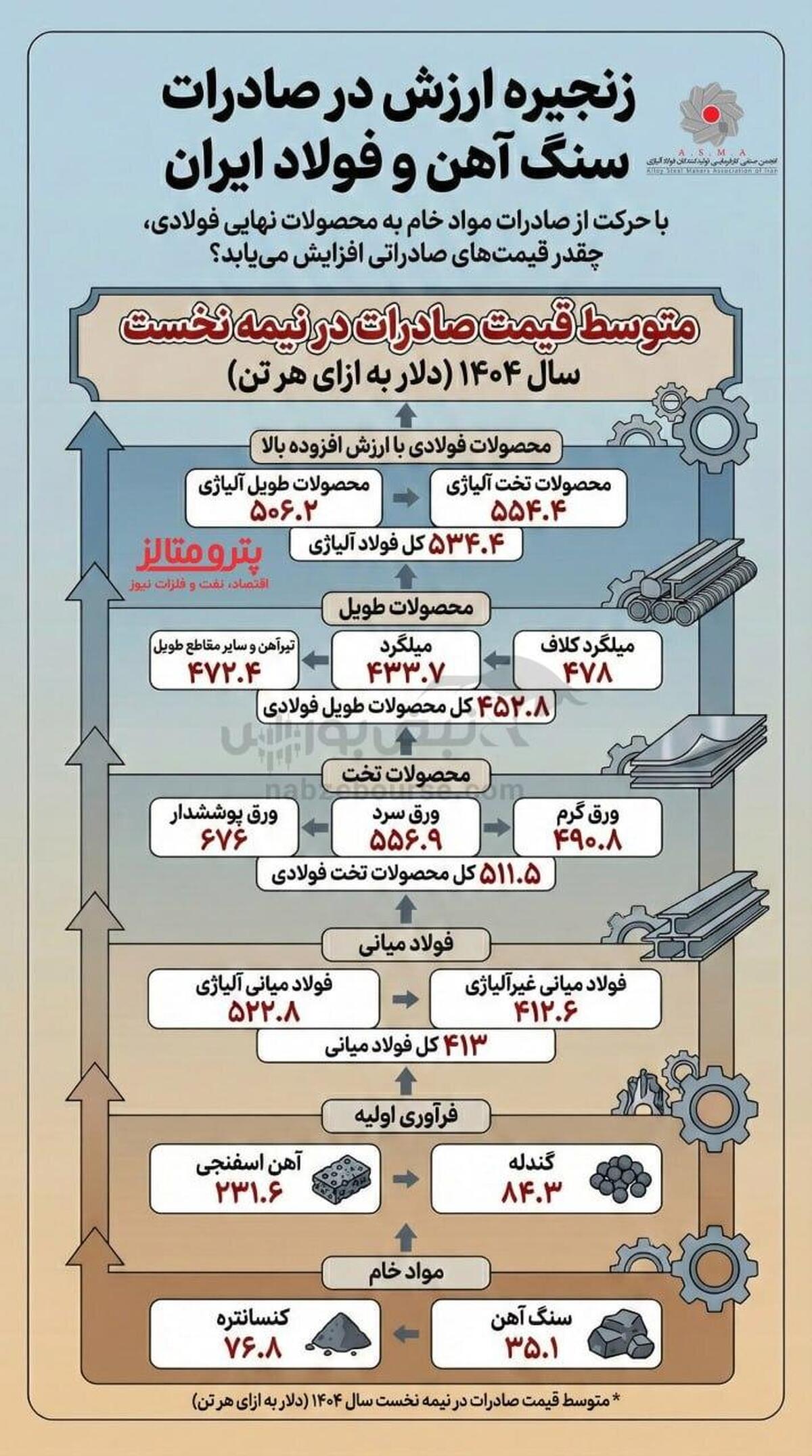 به گزارش نبض بورس، داده‌های منتشرشده توسط انجمن تولیدکنندگان فولاد آلیاژی مربوط به متوسط قیمت‌های صادراتی زنجیره فولاد در نیمه نخست سال ۱۴۰۴، شکاف عمیق قیمتی میان فروش صادراتی مواد خام معدنی و محصولات نهایی فولادی را آشکار می‌سازد. اینفوگرافیک فوق در این خصوص را ببینید.