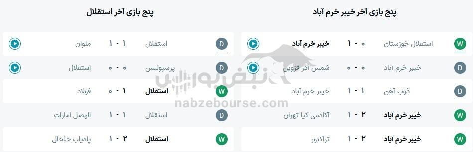 در پنج بازی اخیر 2 برد و 3 تساوی برای استقلال حاصل شده است و همچنین در پنج بازی اخیر خیبر خرم آباد 2 تساوی و 3 برد حاصل شده است.