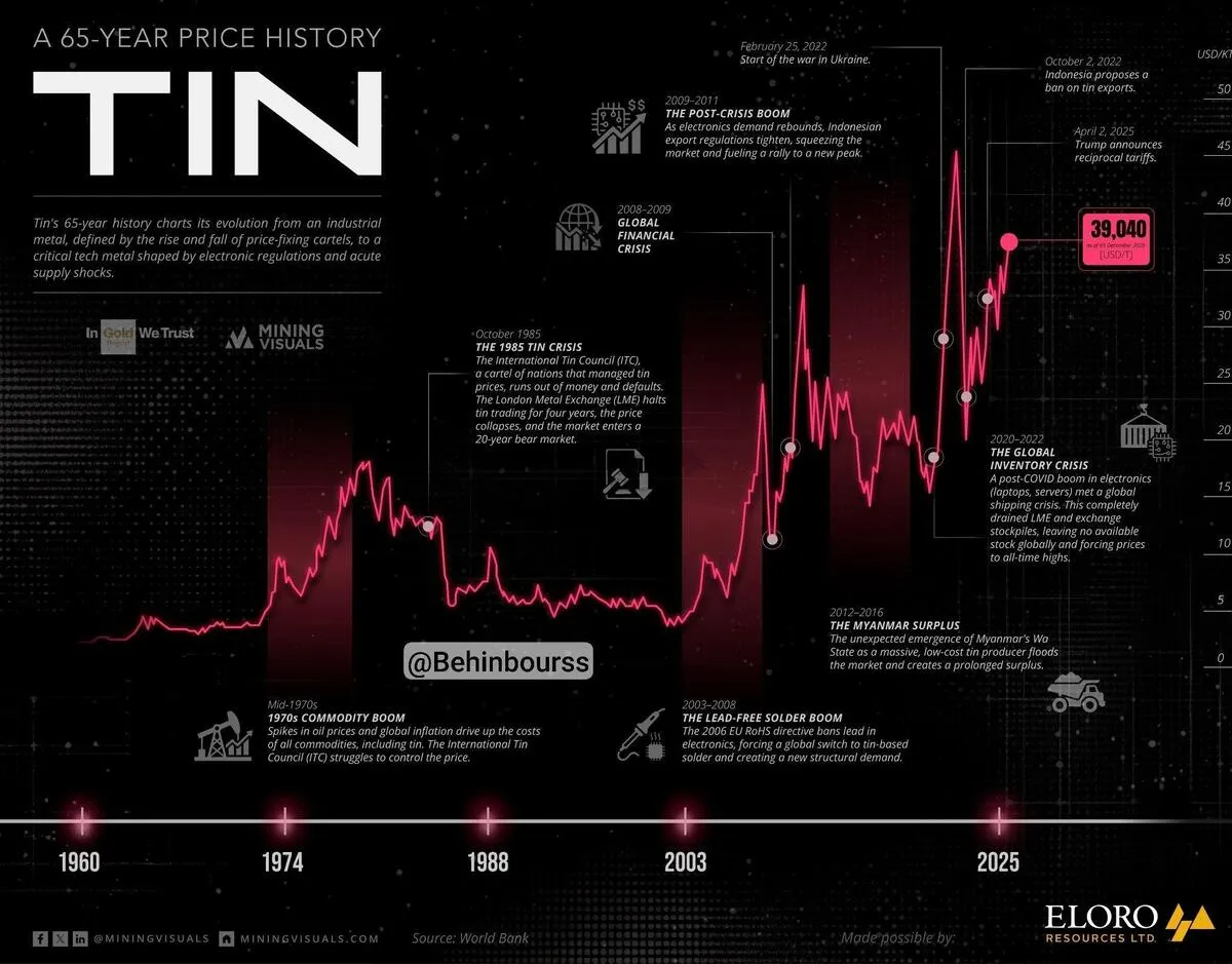 به گزارش نبض بورس، قیمت قلع طی دههها بر اثر بحرانها، کمبود عرضه، مقررات الکترونیک و رویدادهای ژئوپولیتیک شدیداً نوسان کرده است.