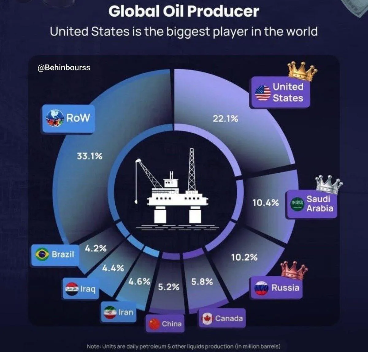 به گزارش نبض بورس، ایالات متحده با در اختیار داشتن ۲۲٫۱ درصد از تولید روزانه مایعات نفتی جهان، جایگاه بزرگترین تولیدکننده جهان را در اختیار دارد.