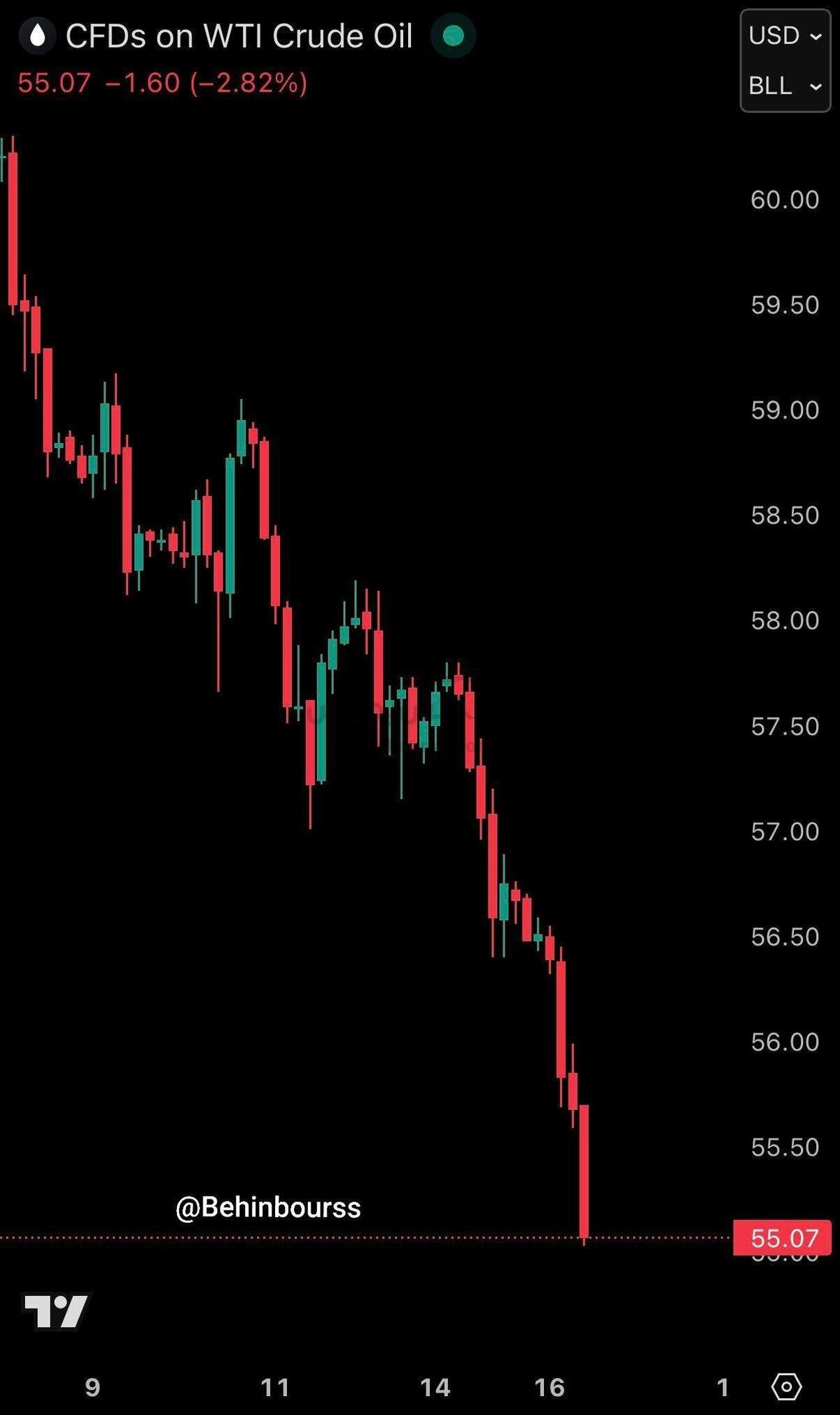 به گزارش نبض بورس، قیمت نفت آمریکا به ۵۵ دلار در هر بشکه سقوط کرده و به پایینترین سطح خود از فوریه ۲۰۲۱ رسیده است.