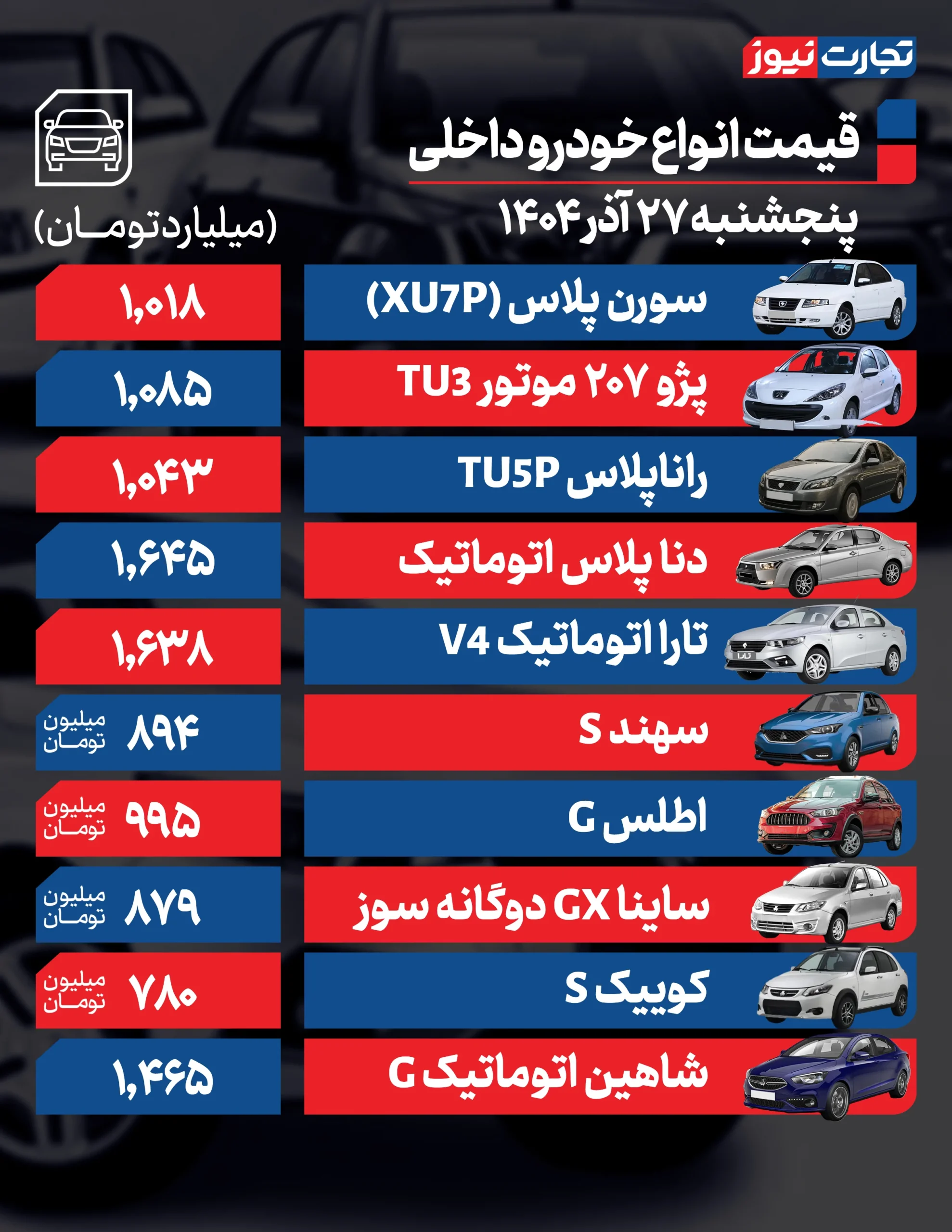 قیمت انواع خودرو داخلی و خارجی امروز ۲۷ آذر ۱۴۰۴