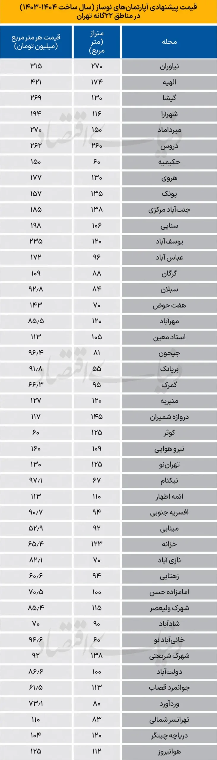 تحقیقات میدانی همچنین نشان می‌دهد، بیشترین حجم آپارتمان‌‌های نوساز در بازار به مناطق شمالی تهران اختصاص دارد و ۵منطقه شمالی پایتخت در مقایسه با دیگر مناطق، نیمی از آپارتمان‌‌های نوساز ارائه‌شده به بازار توسط عرضه‌‌کنندگان را به خود اختصاص داده‌اند و منطقه ۱۹ با عرضه ۱۱ آپارتمان نوساز در ۲۵ آذر به بازار، کم‌ترین میزان آپارتمان‌‌های نوساز را به خود اختصاص داده‌است.