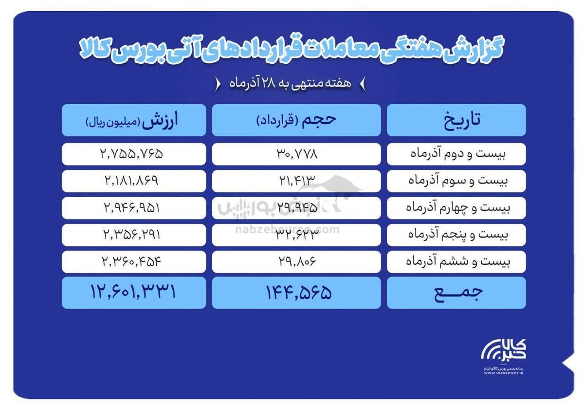 بررسی روند معاملات قراردادهای آتی بورس کالای ایران درهفته منتهی به ۲۸ آذرماه نشان می دهد که در هفته گذشته ارزش معاملات بازار آتی به بیش از هزار و ۲۶۰ میلیارد تومان رسید