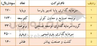 وپایا: ۱۷۰ ریال                کتوسعه: ۱۷۳۰ ریال                    وتوصا: ۳۳۰ ریال              وپترو: ۶۵۰۰ ریال               غاذر: ۱۶۰ ریال