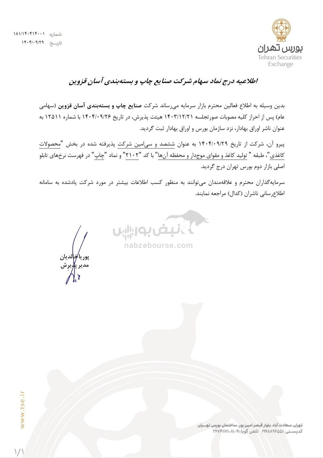 مطابق اطلاعیه بورس تهران، سهام شرکت صنایع چاپ و بستهبندی آسان قزوین از تاریخ ۱۴۰۴/۰۹/۲۹ بهعنوان ششصد و سیامین شرکت پذیرفتهشده در بخش «محصولات کاغذی»، طبقه تولید کاغذ و مقوای موجدار و محفظه آنها با کد ۲۱۰۲ و نماد «چاپ» در تابلو اصلی بازار دوم بورس تهران درج شد.