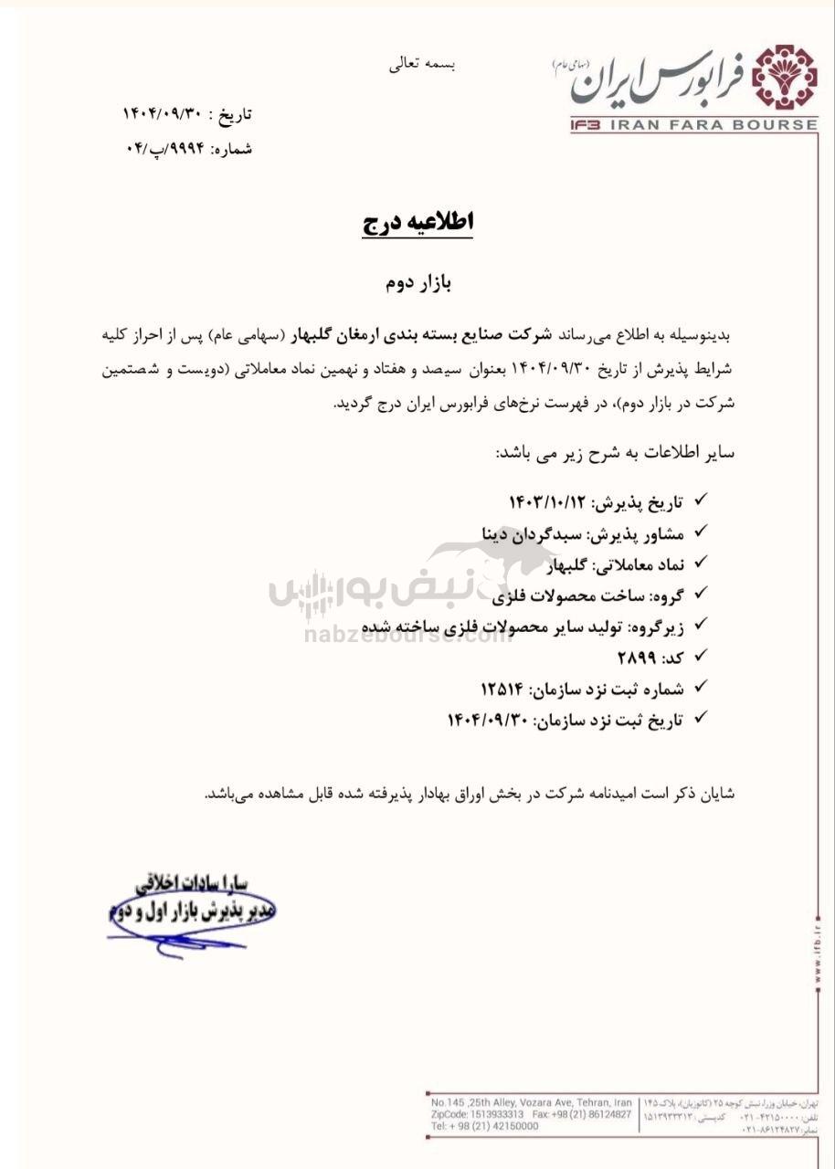 مطابق اطلاعیه فرابورس ایران، شرکت صنایع بستهبندی ارمغان گلبهار (سهامی عام) پس از احراز کلیه شرایط پذیرش، از تاریخ ۱۴۰۴/۰۹/۳۰ بهعنوان سیصد و هفتاد و نهمین نماد معاملاتی (دویست و شصتمین شرکت در بازار دوم) در فهرست نرخهای فرابورس ایران درج شد.