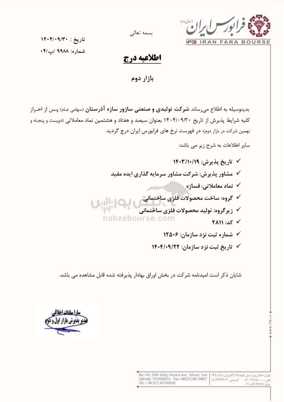 مطابق اطلاعیه فرابورس ایران، شرکت تولیدی و صنعتی سازور سازه آذرستان (سهامی عام) از تاریخ ۱۴۰۴/۰۹/۳۰ بهعنوان سیصد و هفتاد و هشتمین نماد معاملاتی (دویست و پنجاه و نهمین شرکت بازار دوم) در فرابورس درج شد.