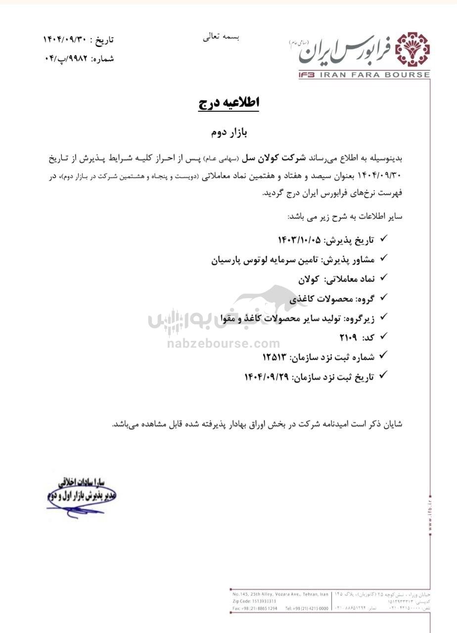 براساس اطلاعیه فرابورس ایران، شرکت کولان سل (سهامی عام) نیز از تاریخ ۱۴۰۴/۰۹/۳۰ بهعنوان سیصد و هفتاد و هفتمین نماد معاملاتی و دویست و پنجاه و هشتمین شرکت بازار دوم فرابورس در فهرست نرخها درج گردید.