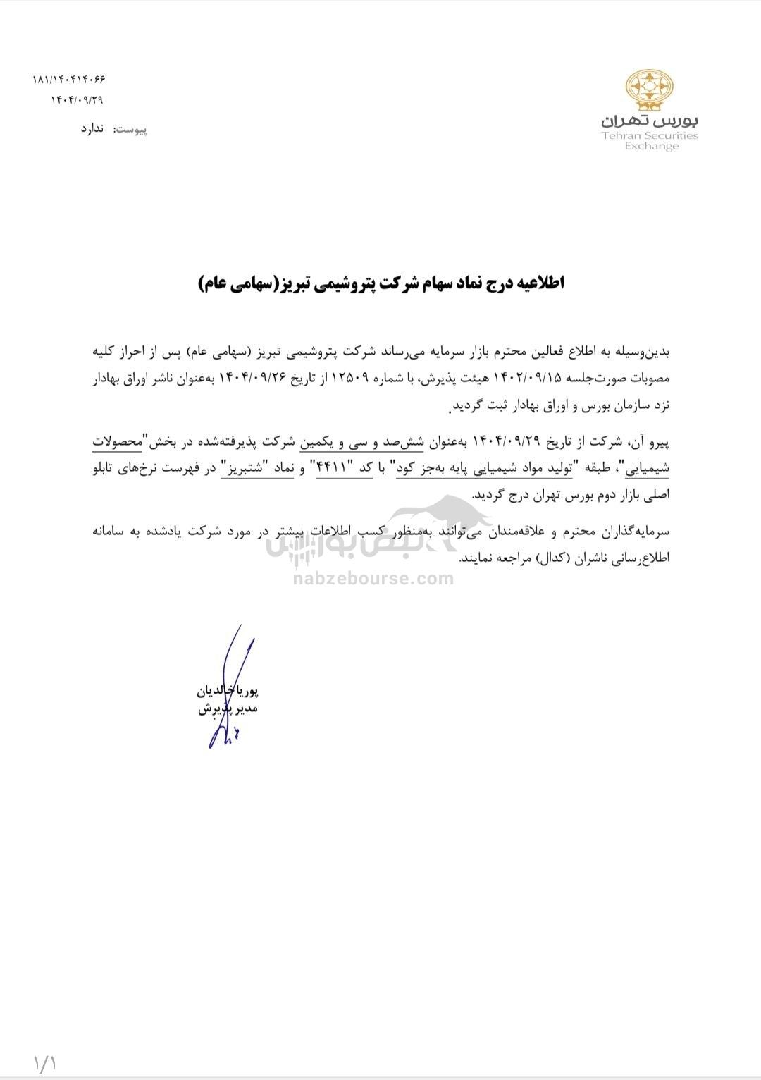 مطابق اطلاعیه بورس تهران، شرکت پتروشیمی تبریز (سهامی عام) پس از ثبت نزد سازمان بورس، از تاریخ ۱۴۰۴/۰۹/۲۹ بهعنوان ششصد و سی و یکمین شرکت پذیرفتهشده در بخش محصولات شیمیایی، طبقه تولید مواد شیمیایی پایه (بهجز کود) با کد ۴۴۱۱ و نماد «شتبریز» در تابلو اصلی بازار دوم بورس تهران درج شد.
