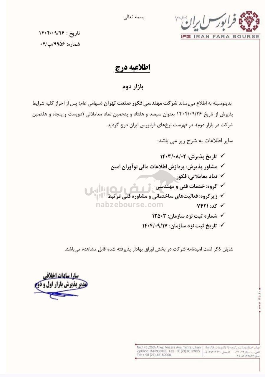 طبق اطلاعیه فرابورس ایران، شرکت مهندسی فکور صنعت تهران (سهامی عام) از تاریخ ۱۴۰۴/۰۹/۲۶ بهعنوان سیصد و هفتاد و پنجمین نماد معاملاتی و دویست و پنجاه و هفتمین شرکت بازار دوم در فهرست نرخهای فرابورس درج گردید.