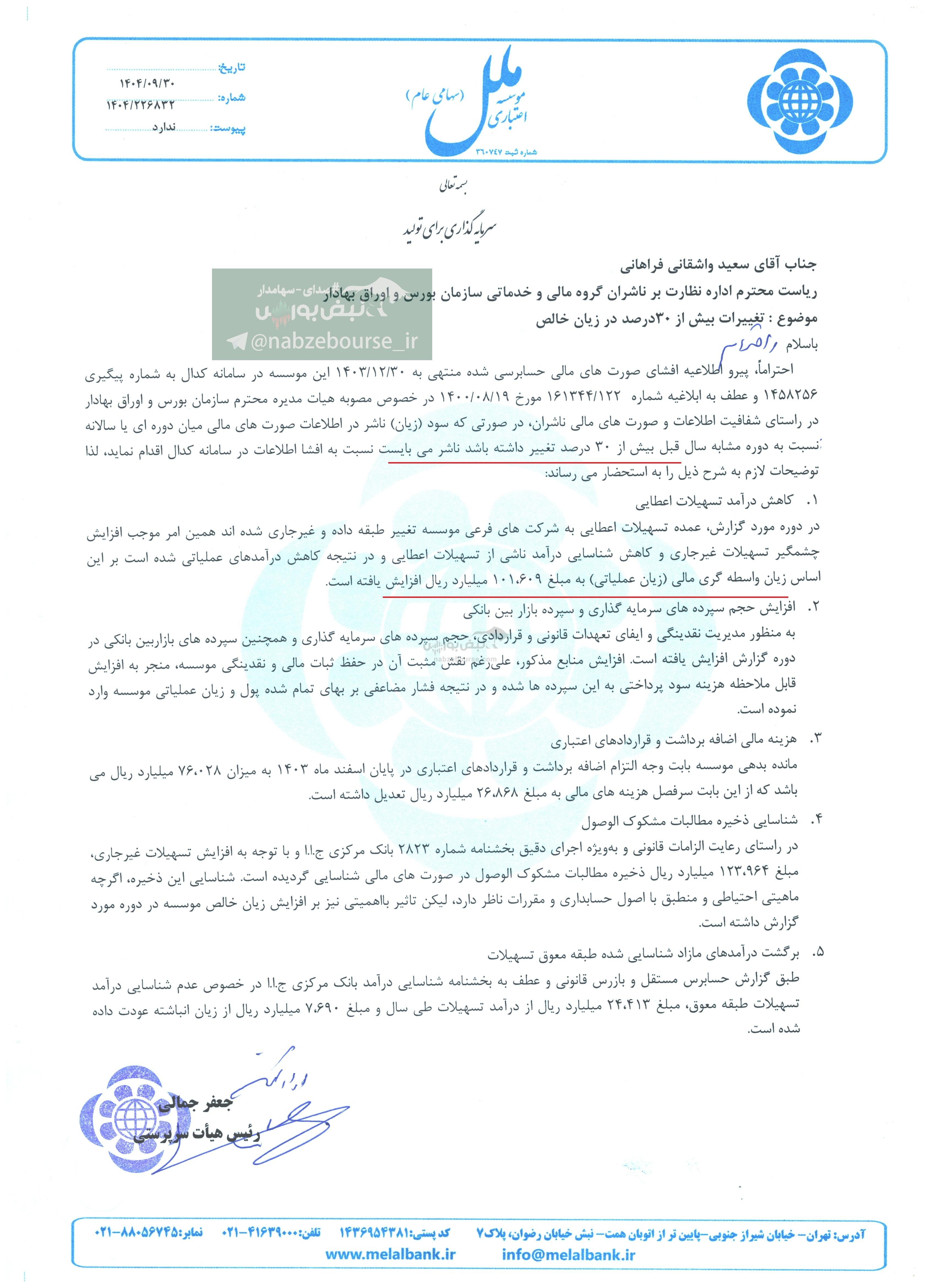 جعفر جمالی، رئیس هیات سرپرستی موسسه ملل، در نامه‌ای به سعید واشقانی فراهانی، رئیس اداره نظارت بر ناشران سازمان بورس، توضیح داد که تغییرات بیش از ۳۰ درصدی در زیان خالص موسسه ناشی از کاهش درآمد تسهیلات اعطایی بوده است.