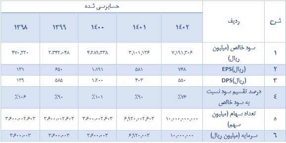 بر اساس مصوبه مجمع عمومی سالانه، ۷۶ درصد سود خالص سال مالی منتهی به آذر ۱۴۰۲ معادل ۵۵۰ میلیارد تومان بین سهامداران تقسیم شده است. همچنین پیش‌بینی می‌شود در سال‌های مالی ۱۴۰۳ تا ۱۴۰۵، حدود ۳۰ درصد سود خالص سالانه به عنوان سود تقسیمی در نظر گرفته شود.