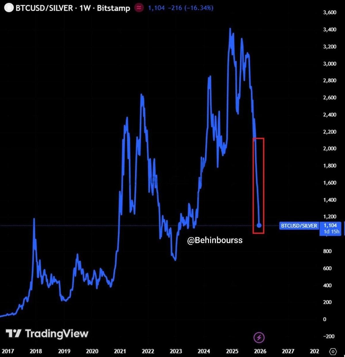 به گزارش نبض بورس، نسبت بیت‌کوین به نقره اکنون به ۱,۱۰۴ رسیده است که کمترین میزان از سپتامبر ۲۰۲۳ است.