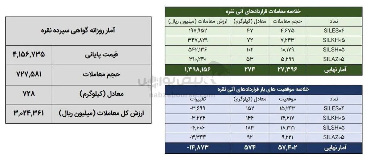 همچنین ۲۷ هزار و ۳۹۶ قرارداد آتی معادل ۲۷۴ کیلوگرم شمش نقره به ارزش ۱۳۹.۸ میلیارد تومان منعقد شد. در پایان روز معاملاتی گذشته موقعیت های باز قراردادهای آتی نقره معادل ۵۷۴ کیلوگرم شمش نقره بود. در قراردادهای آتی شاهد کاهش ۱۴ هزار و ۸۷۳ موقعیت در مجموع موقعیت های باز قراردادهای مبتنی بر نقره بودیم.
