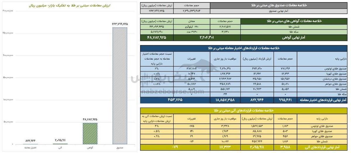 روز گذشته همچنین ۹۹۵ هزار و ۴۶۱ قرارداد اختیار معامله کالایی به ارزش ۸۲ میلیارد تومان منعقد شد. روز گذشته در پنج نماد شمش طلا، صندوق طلای لوتوس، درخشان، جواهر و کهربا معامله انجام شد که بیشترین ارزش معاملات به قراردادهای اختیار معامله لوتوس اختصاص یافت.در این روز حجم معاملات تمام قراردادهای اختیار معامله نماد صندوق طلای لوتوس ۷۷۱،۲۹۶ قرارداد بود.