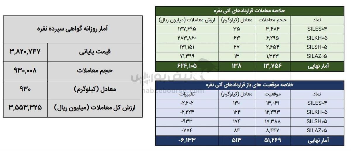 همچنین ۱۳ هزار و ۷۵۶ قرارداد آتی معادل ۱۳۸ کیلوگرم شمش نقره به ارزش ۶۲.۴ میلیارد تومان منعقد شد. در پایان روز معاملاتی گذشته موقعیت های باز قراردادهای آتی نقره معادل ۵۱۳ کیلوگرم شمش نقره بود. در قراردادهای آتی شاهد کاهش ۶ هزار و ۱۳۳ موقعیت در مجموع موقعیت های باز قراردادهای مبتنی بر نقره بودیم.
