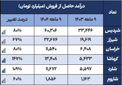 بر اساس دادهها شپدیس درآمد حاصل از فروش خود را از ۳۳ هزار و ۴۴۶ میلیارد تومان در ۹ ماهه ۱۴۰۳ به ۶۰ هزار و ۳۰۶ میلیارد تومان در ۹ ماهه ۱۴۰۴ رسانده و رشد ۸۰ درصدی را ثبت کرده است؛ رقمی که جایگاه این شرکت را بهعنوان لیدر درآمدی گروه تثبیت میکند.