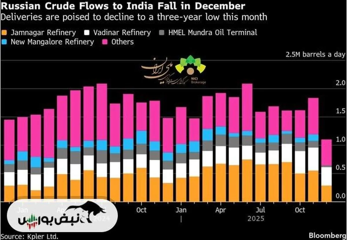 به گزارش نبض بورس، واردات نفت خام روسیه به هند در ماه دسامبر به حدود ۱.۱ میلیون بشکه در روز کاهش یافته که پایین‌ترین سطح در سه سال اخیر است. این رقم در ماه نوامبر حدود ۱.۸ میلیون بشکه در روز بود و حتی در میانه دسامبر تا ۷۱۲ هزار بشکه در روز هم سقوط کرد.