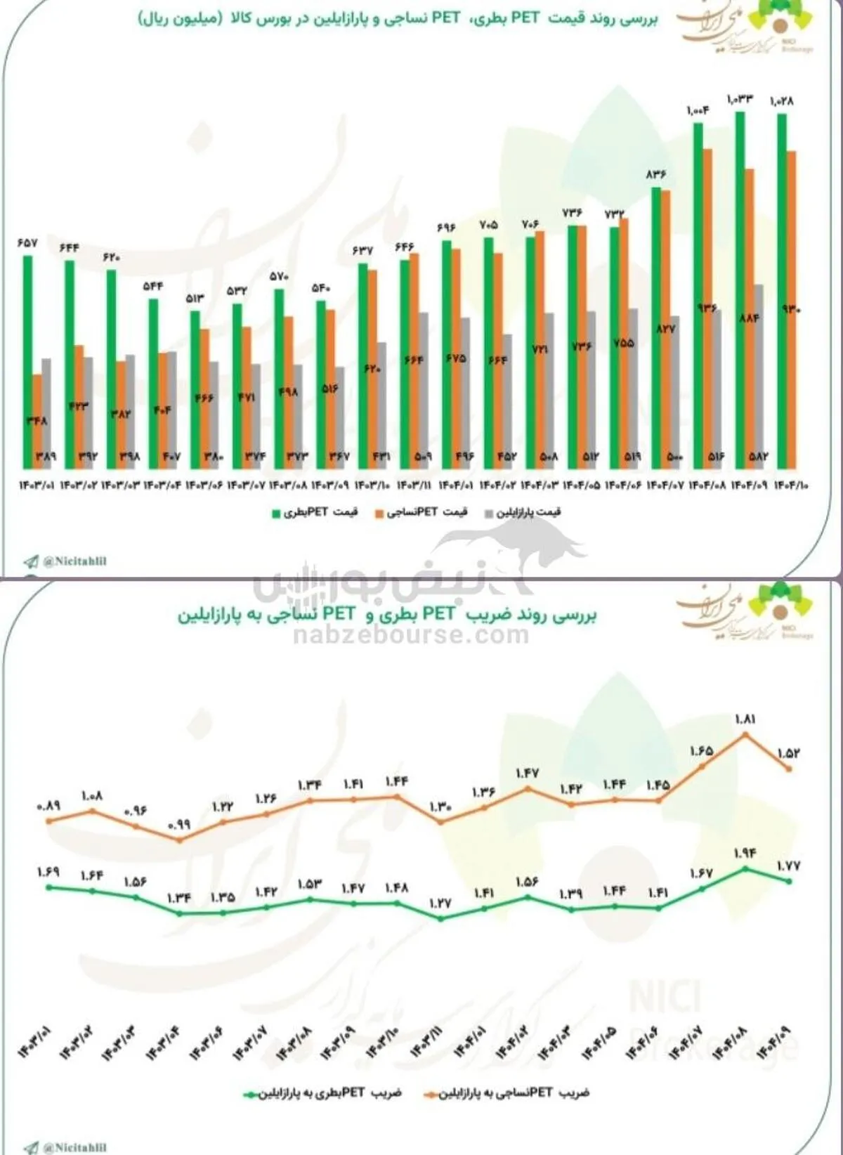 در مقابل، نرخ PET بطری از ۱٬۰۰۳.۷ به ۱٬۰۳۲.۹ میلیون ریال افزایش داشته (رشد حدود ۲.۹٪) و نرخ PET نساجی از ۹۳۵.۵ به ۸۸۳.۸ میلیون ریال کاهش یافته است. (افت حدود ۵.۵٪).