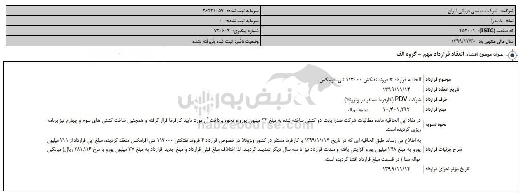 شرکت صنعتی دریایی ایران در طی اصلاحیه ای در خصوص قرارداد با شرکت PDV اعلام داشت، طبق الحاقیه ای که در تاریخ ١٣٩٩/١١/١۴ با کارفرما مستقر در کشور ونزوئلا در خصوص قرارداد ۴ فروند نفتکش ١١٣٠٠٠ تنی افرامکس منعقد گردیده، مبلغ این قرارداد از ٢١١ میلیون یورو به مبلغ ٢۴٨ میلیون یورو افزایش یافته و مدت قرارداد نیز تا سه سال دیگر تمدید گردید. لذا اختلاف مبلغ قبلی قرارداد و مبلغ جدید قرارداد به مبلغ ٣٧ میلیون یورو با نرخ ٢٨١,١١۶ ریال( میانگین حواله سنا ) در قسمت مبلغ قرارداد افشا گردیده است.