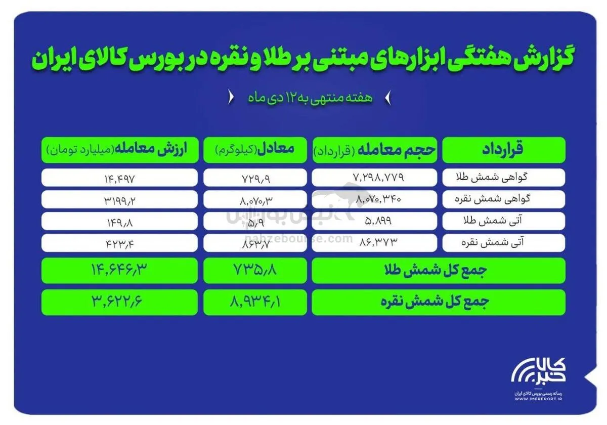 به این ترتیب در هفته گذشته در مجموع ۸۹۳۴ کیلوگرم شمش نقره به ارزش ۳.۶ همت (۳ هزار و ۶۲۳ میلیارد تومان) و ۷۳۶ کیلوگرم شمش طلا به ارزش ۱۴.۶همت (۱۴ هزار و ۴۶۴ میلیارد تومان) در بورس کالا منعقد شد.