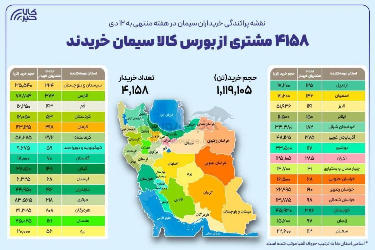 نقشه پراکندگی خریداران در هفته گذشته؛ ،۴۱۵۸ خریدار از ۳۰ استان در بستر بورس کالا سیمان خریدند